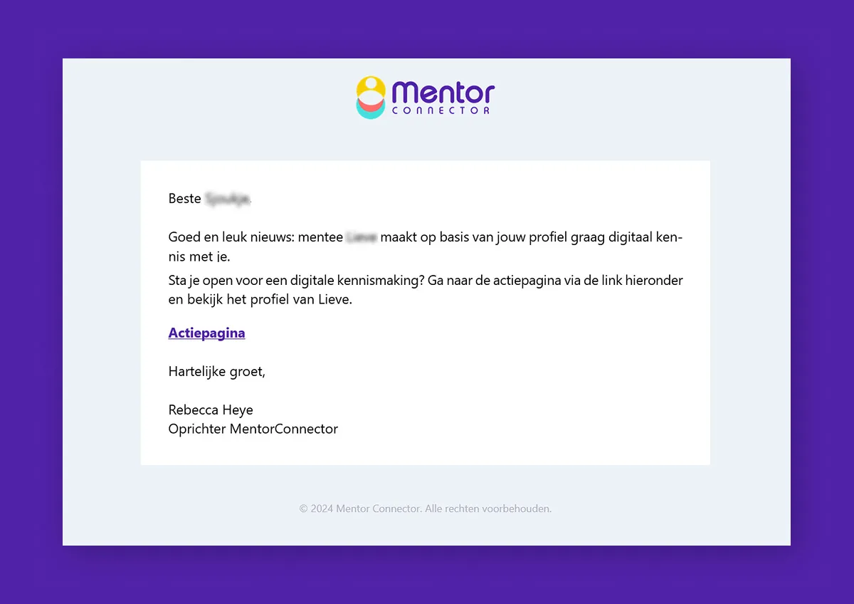 Het constant inloggen op een platform om een specifieke actie uit te voeren, is zowel voor de mentor als de mentee niet ideaal en vaak onpersoonlijk. Daarom is het mogelijk gemaakt om acties uit te voeren via interactieve e-mails en pagina's, op een persoonlijke en toegankelijke manier. Deelnemers hoeven dus niet voor elke actie afzonderlijk in te loggen. Dit sluit aan bij de persoonlijke benadering van MentorConnector.