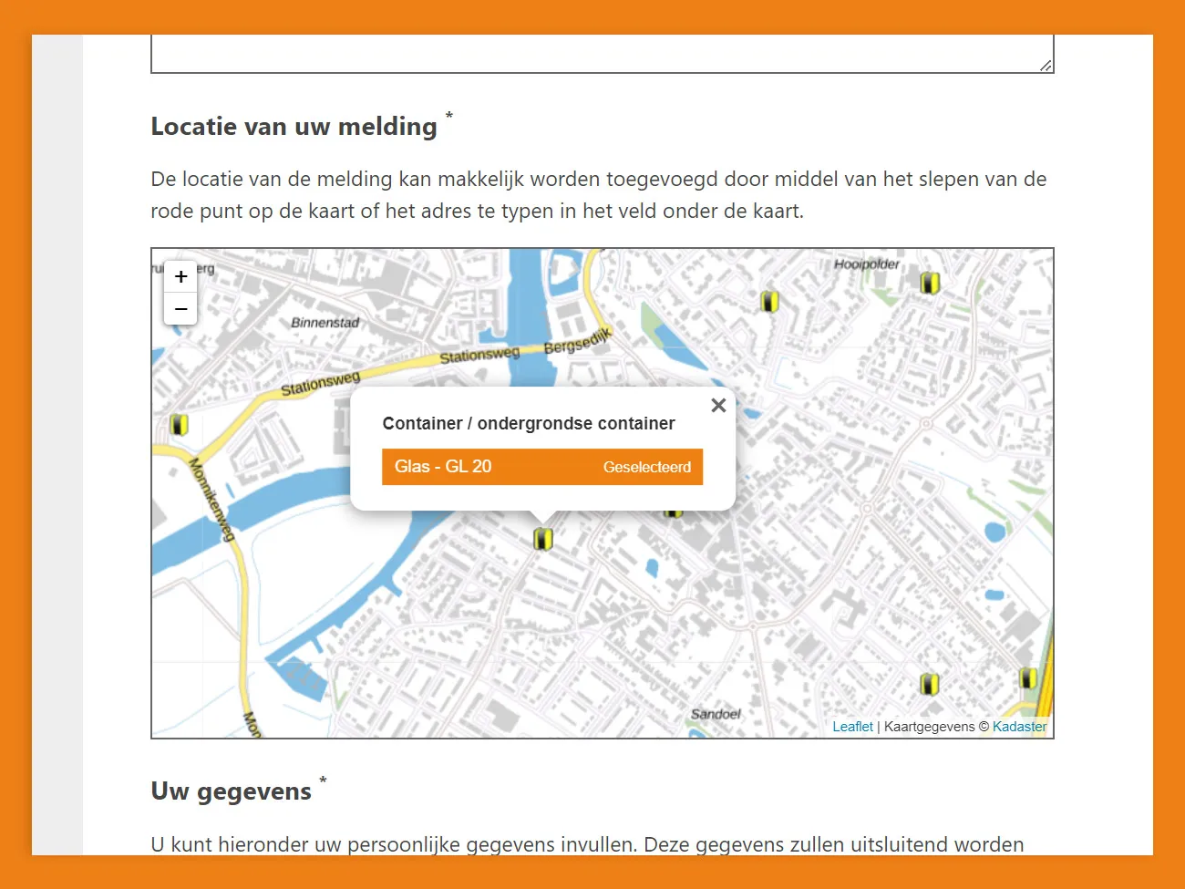 Gezien er binnen de gemeente ondergrondse containers aanwezig zijn, is de aanwezigheid van deze containers ook geïntegreerd in het formulier. Indien de categorie ‘ondergrondse containers’ wordt geselecteerd, worden de locaties van deze containers automatisch als punten op de kaart weergegeven. Daarnaast is er ook een koppeling met een externe leverancier voor de lichtmasten, die rechtstreeks meldingen verstuurt naar deze externe partij. Hierdoor kan er één duidelijk formulier worden aangeboden aan de inwoners en is er een optimale gebruikerservaring.